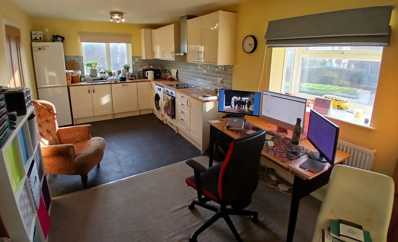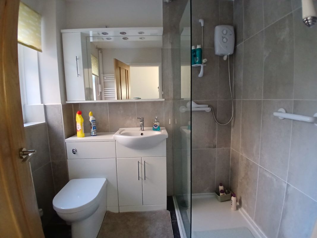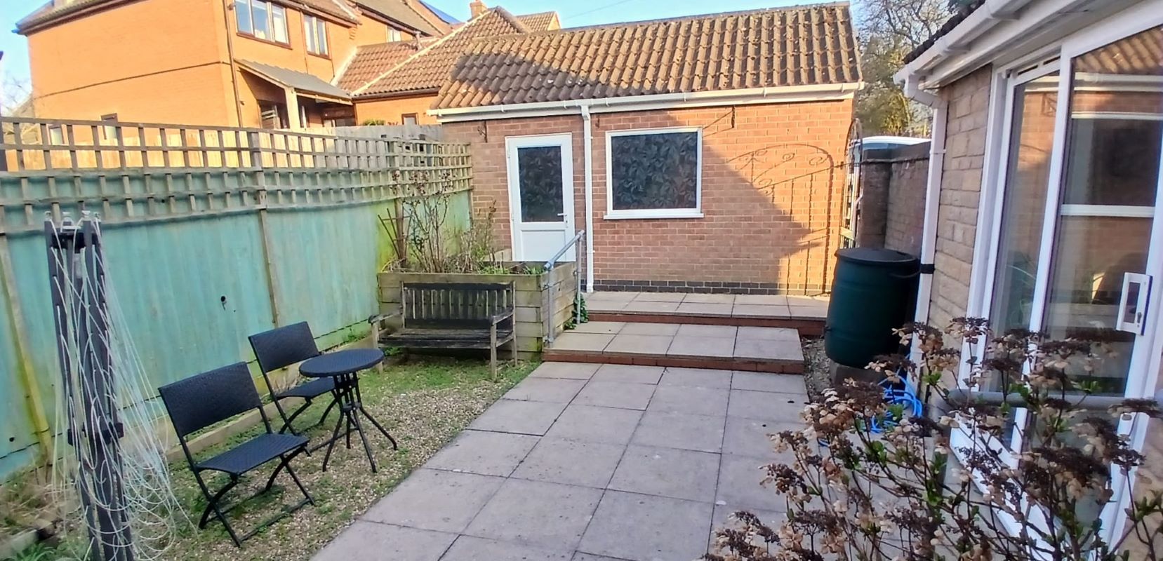 Entrance hallway, open plan kitchen and living area with French doors to patio garden, 2 bedrooms, shower room, storage cupboard.