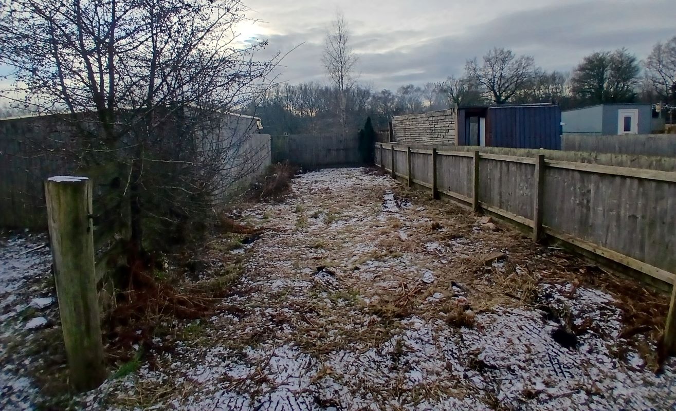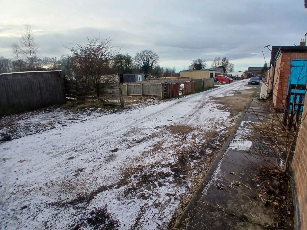 Outside: Front garden, rear yard with outbuilding, rear garden accessed over a shared access road.