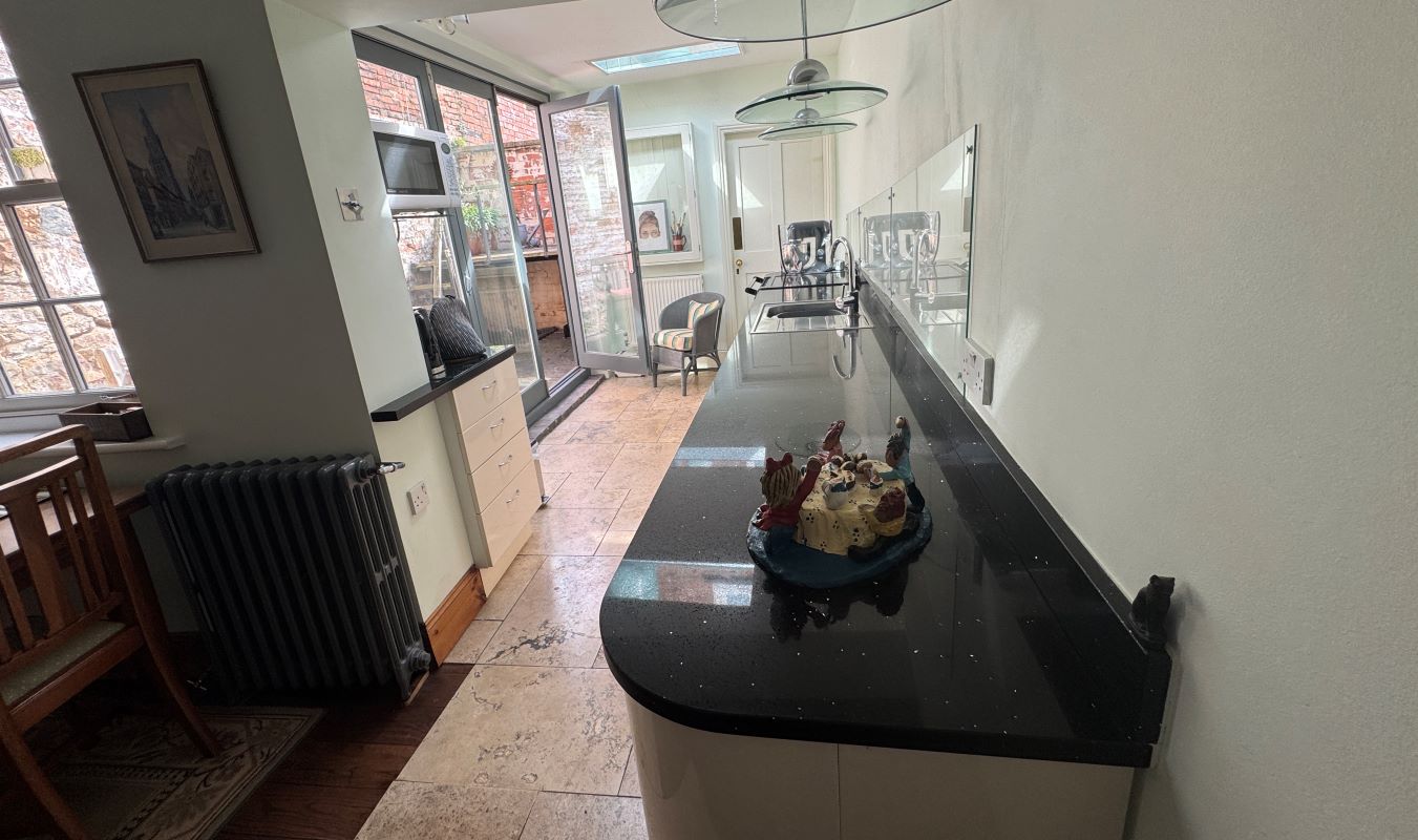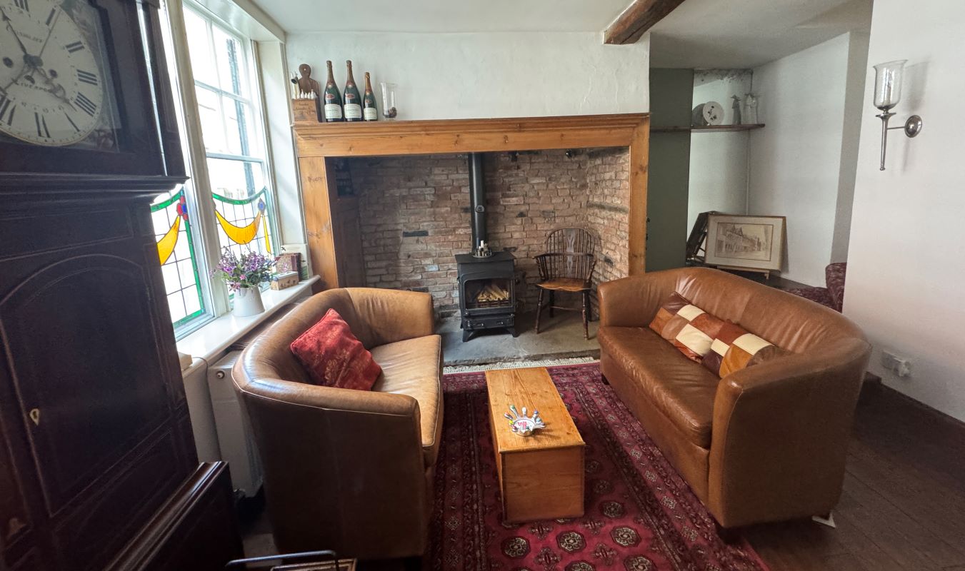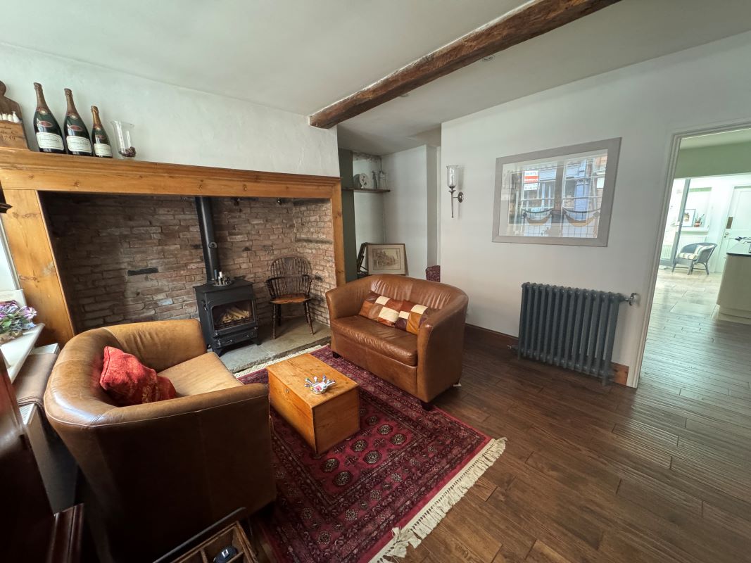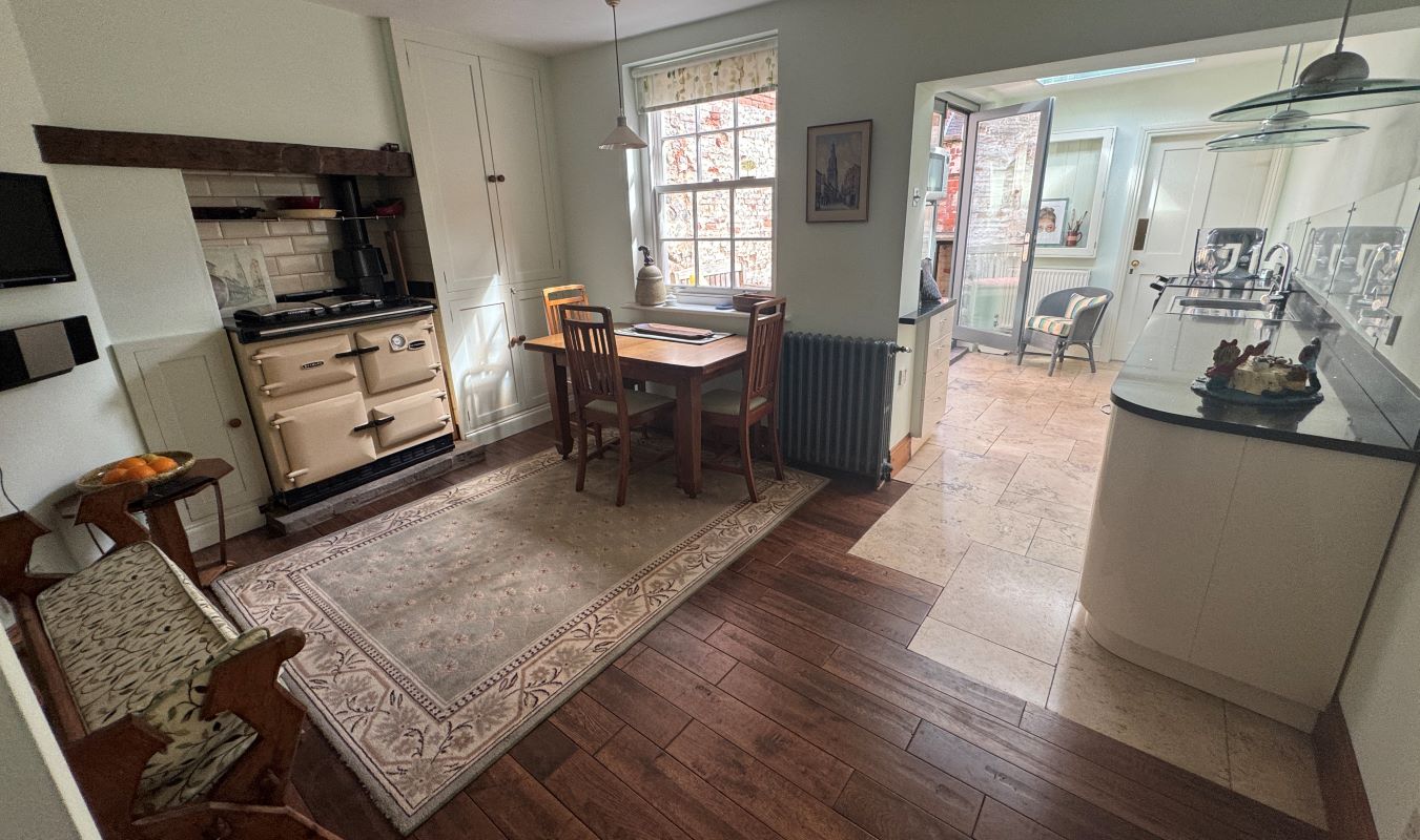 Ground Floor: Lounge with original inglenook fireplace with wood burner, open plan kitchen/diner with 3 panel bifold doors to courtyard garden, WC.